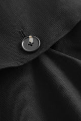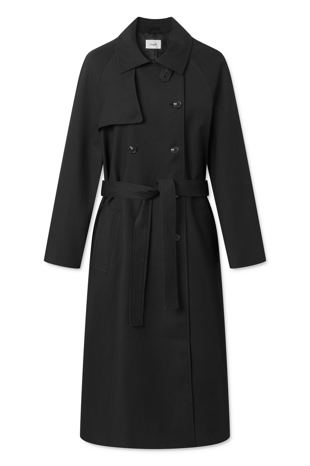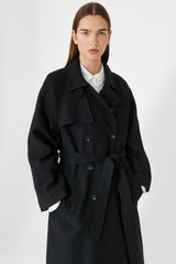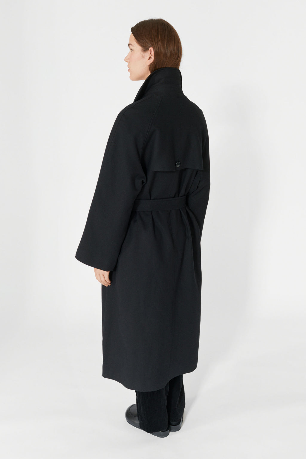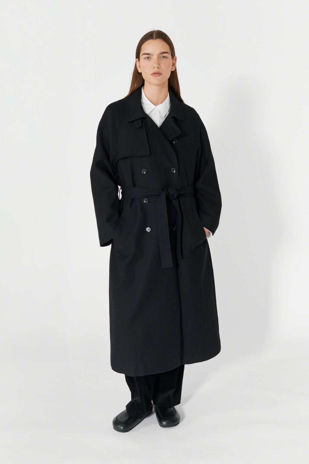 Classic oversized trench coat in a delicious black cotton blend. The Carrie coat has all the classic details of the well-known trench coat: wide lapel, double-breasted, raglan sleeves with straps, belt, loose yoke at the back and on the right front. Buttons and belt buckles are in "horn". Lining in a nice viscose. The belt is a removable belt.
