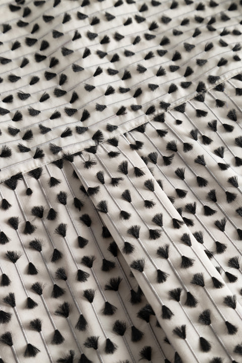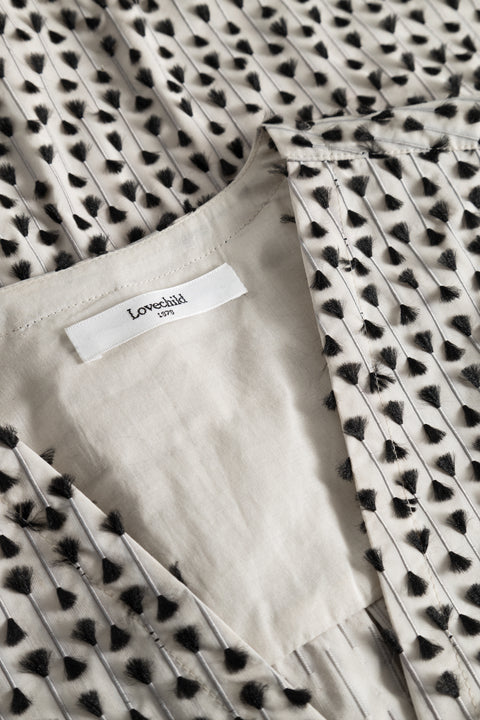 Long dress in a nice cotton/polyester quality that has small fine tassels in a contrasting colour. The dress has a V-neck that buttons down the front, pockets in the side seam and high slits in the side. The sleeves are straight up and down with slits and small cuffs. At the back, the dress has a yoke with wiener. The look is relaxed and slightly oversized.