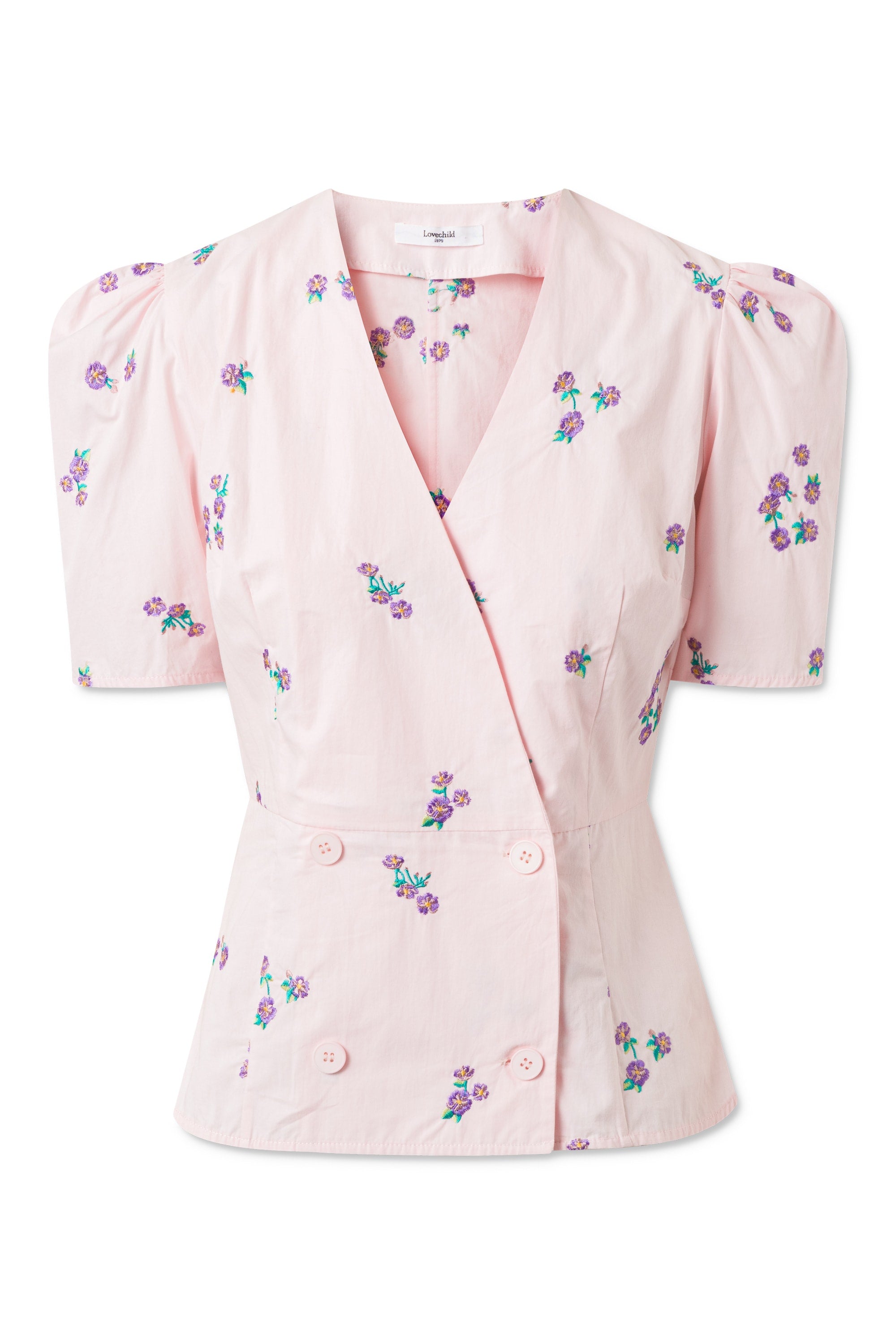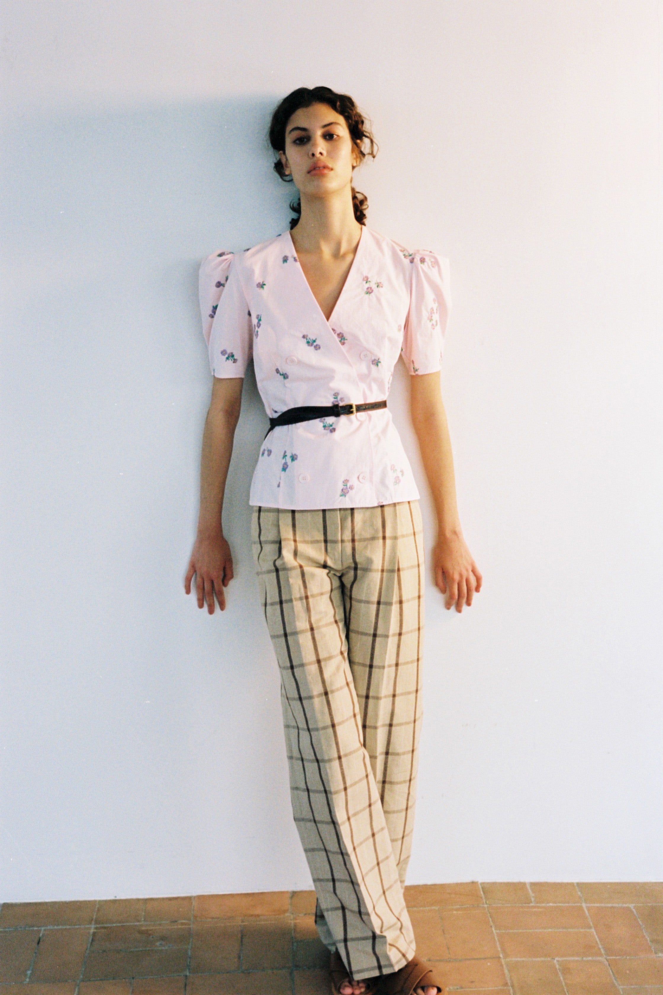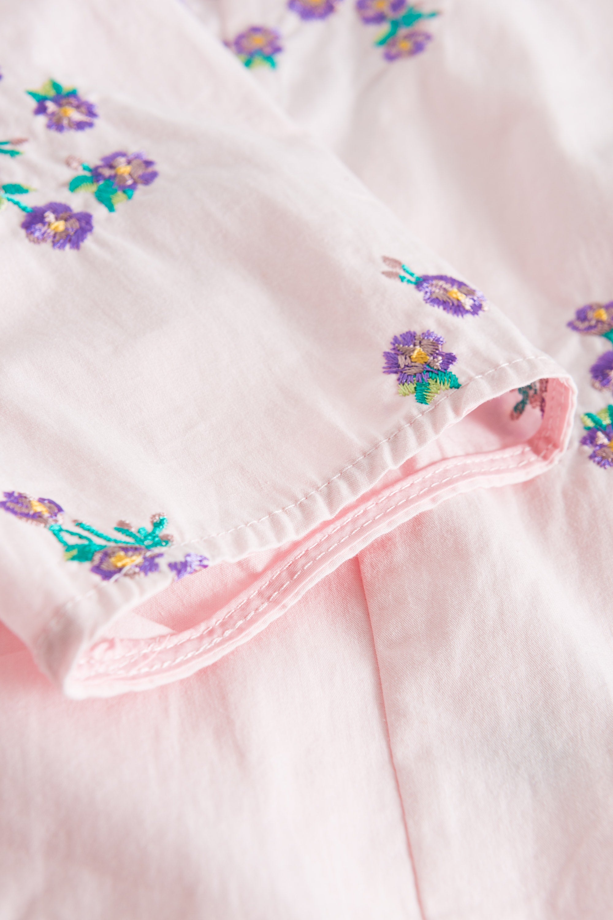 Floral shirt blouse in lovely cotton poplin. The Cora Blouse features the prettiest small embroidered flowers in Lavender and Pastel Green. The sleeves are 3/4 and have pleats at the shoulder. The Cora Blouse is slightly tailored and buttons at the waist with two buttons.
