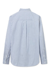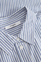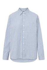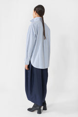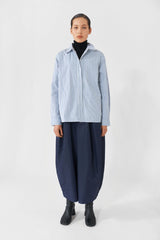 Boxy fit shirt with dropped shoulders and a pocket on the chest. CF opening with buttons. Cuffs and slits on the sleeves with button closures. Pleat at the back on the shoulders. Rounded hem at the bottom with wedge pieces in the side seams.