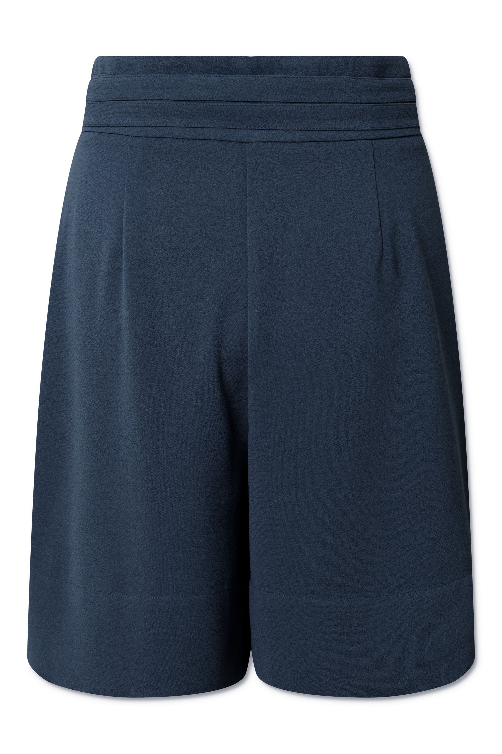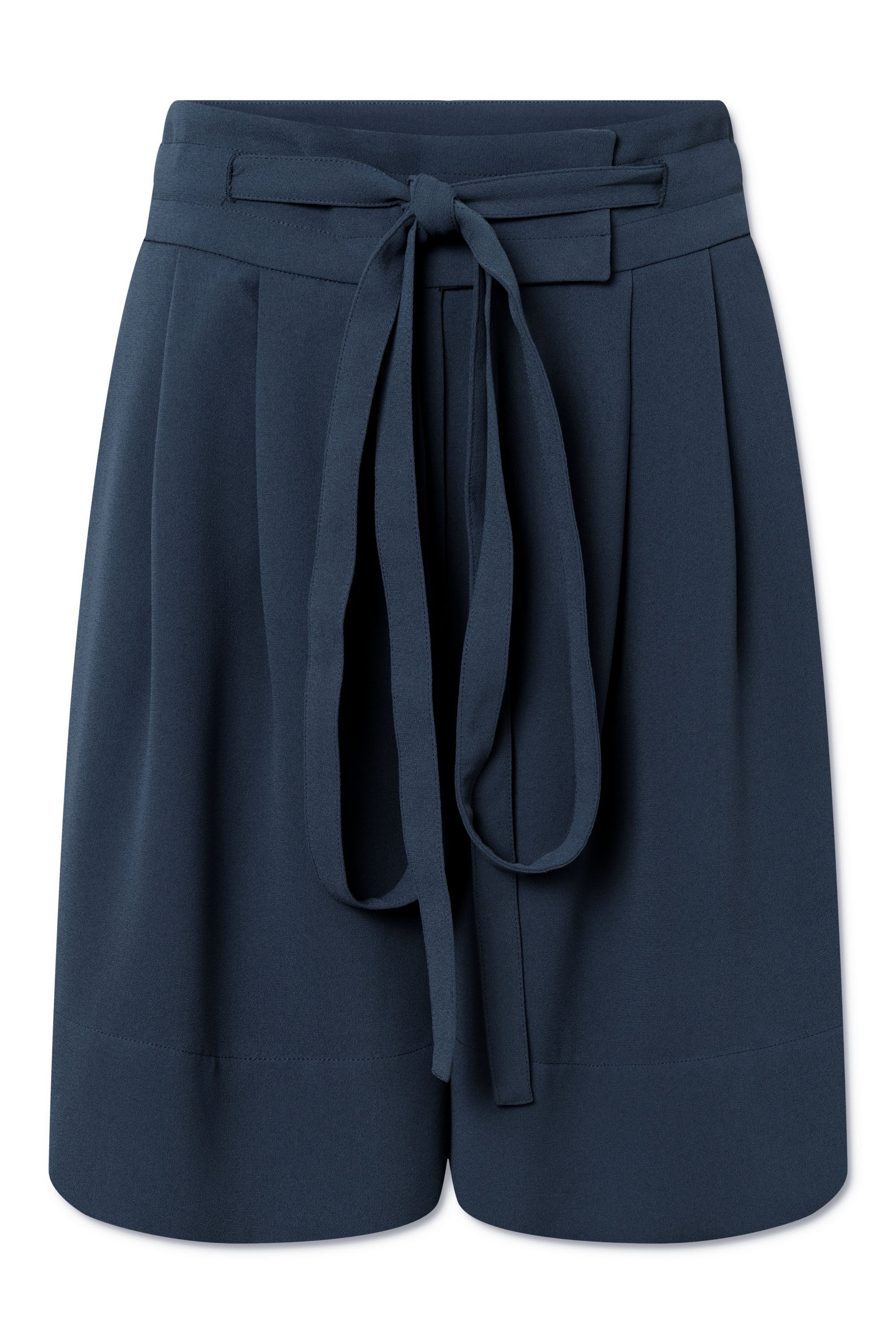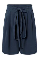 Loose fit shorts with tie band and pockets in side seams. Zipper closure with an inside contra button. Mid rise at waist.