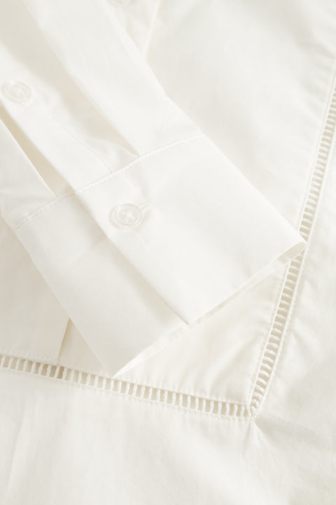 Relaxed shirt dress with ladder lace, mandarine collar and placket button closure. Pockets in the side seam. The look is oversized and relaxed.