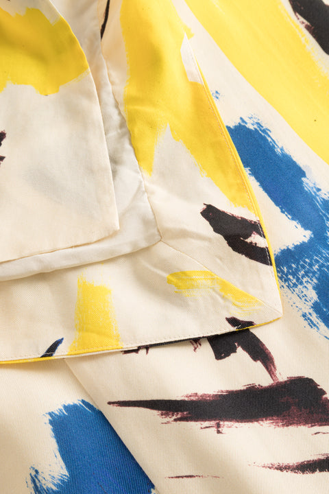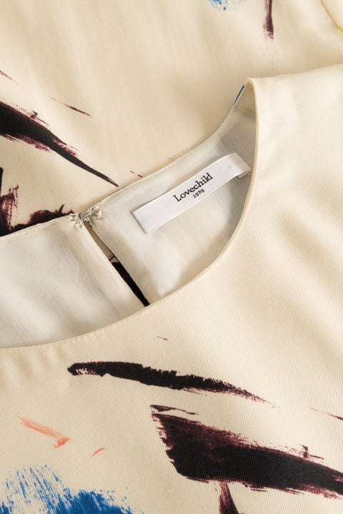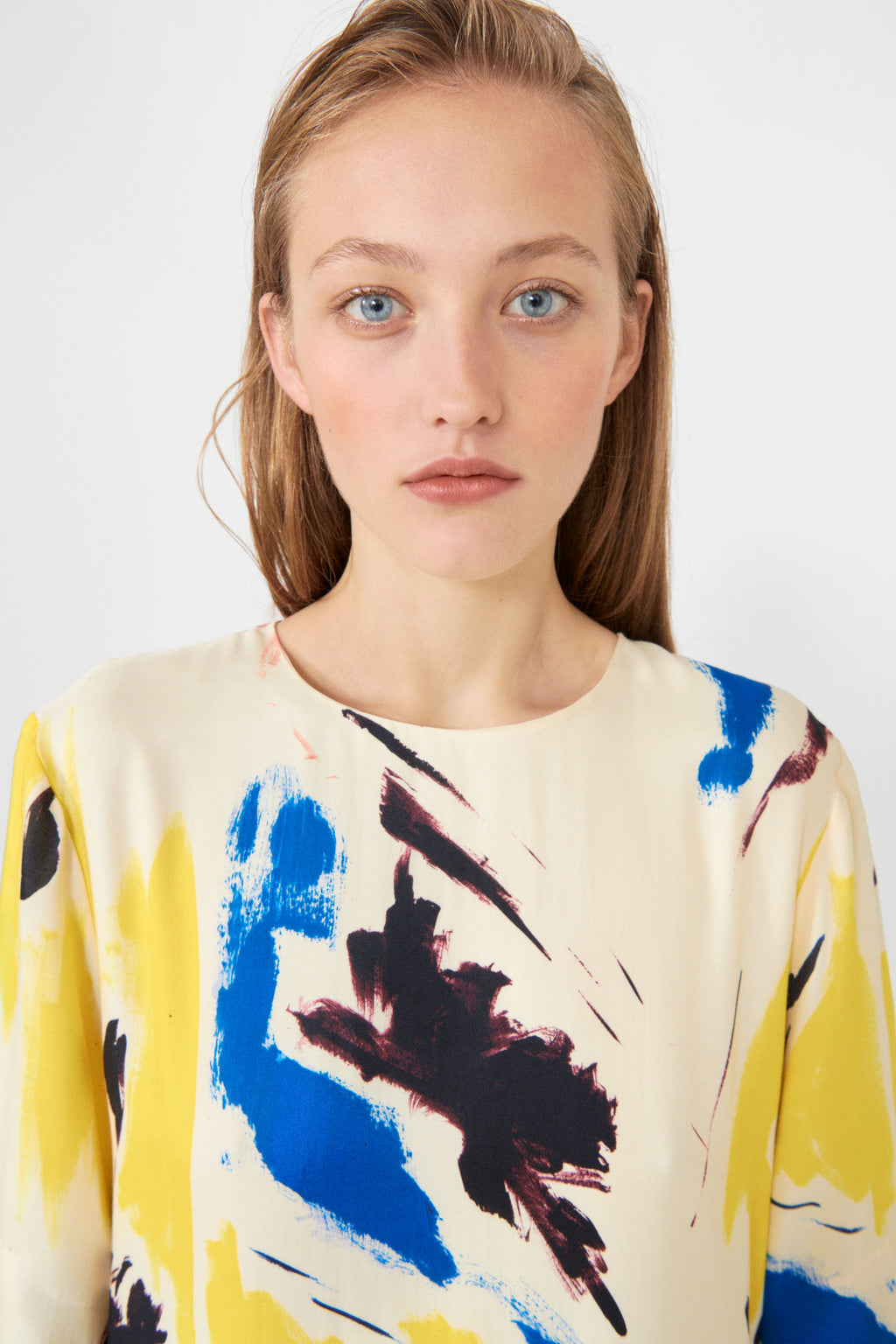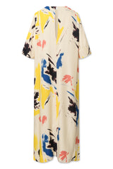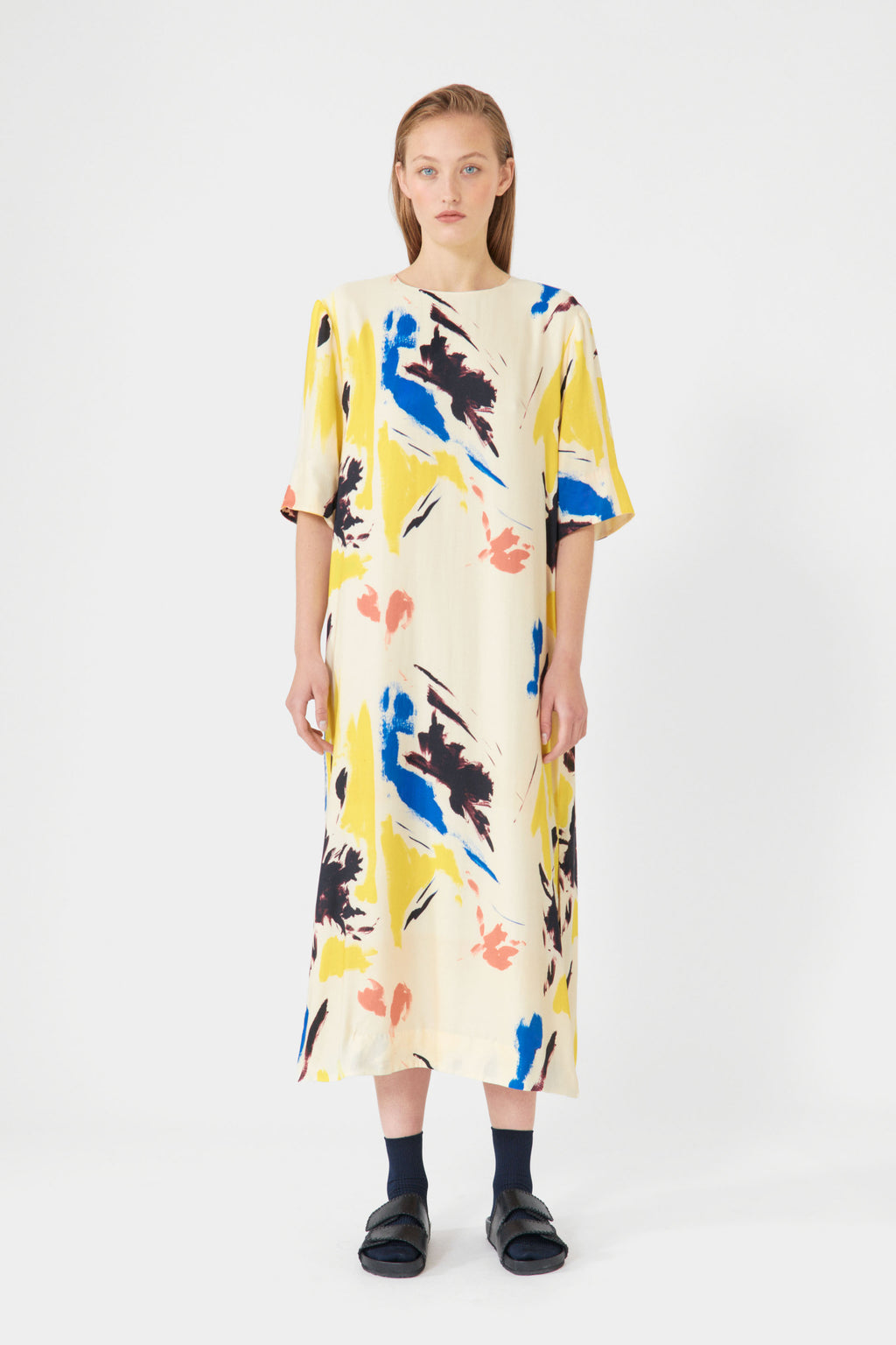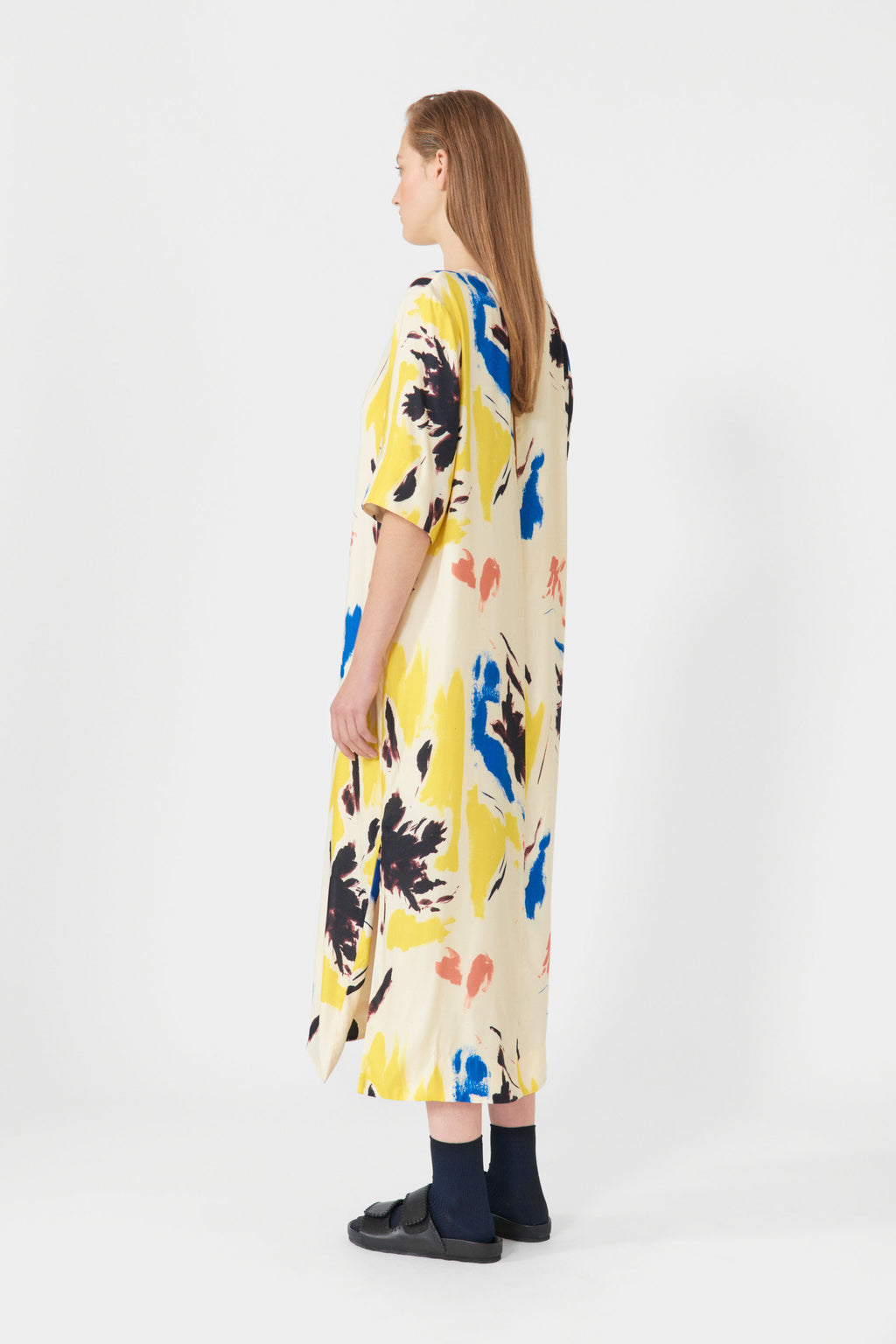Loose dress in a delicious printed silk/viscose quality. The dress has a round neck that closes at the back in a deep slit and is lined with a thin viscose crepe. The sleeves are 3/4 length and the dress has slits on the side. The length is to the middle of the calf. The look is relaxed with a normal fit.