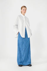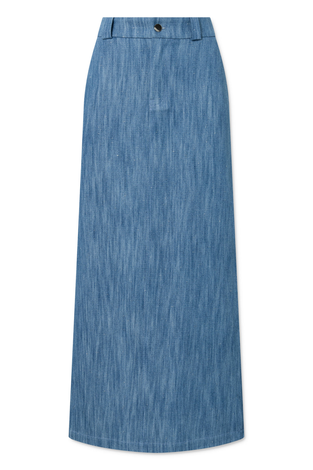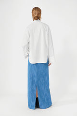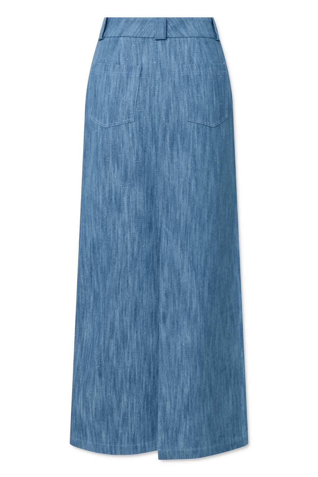 High waisted long skirt in a delicious cotton quality with slanted pockets and patched back pockets. Center back, the skirt has a high slit. The look is relaxed and elegant with a normal fit.