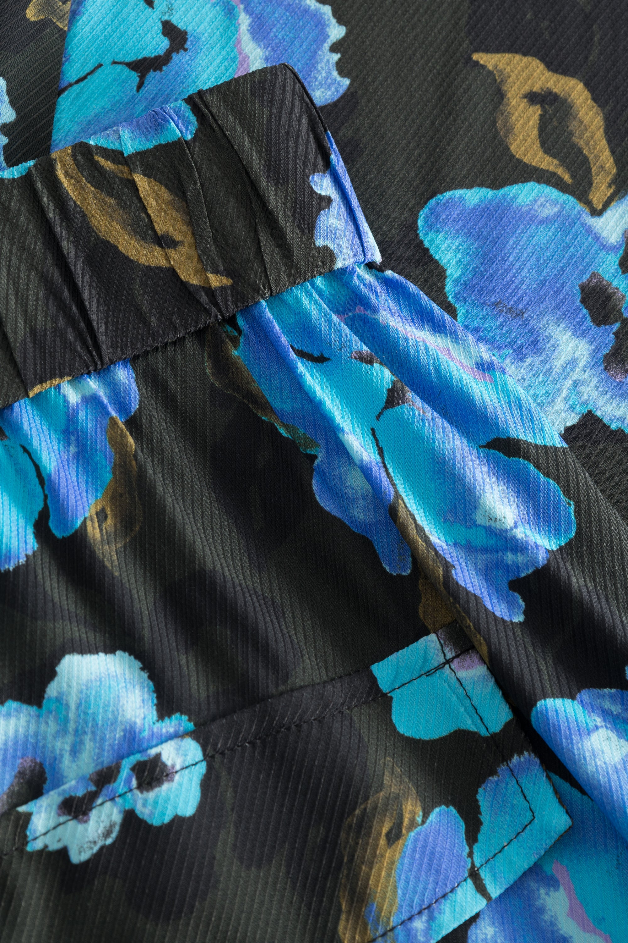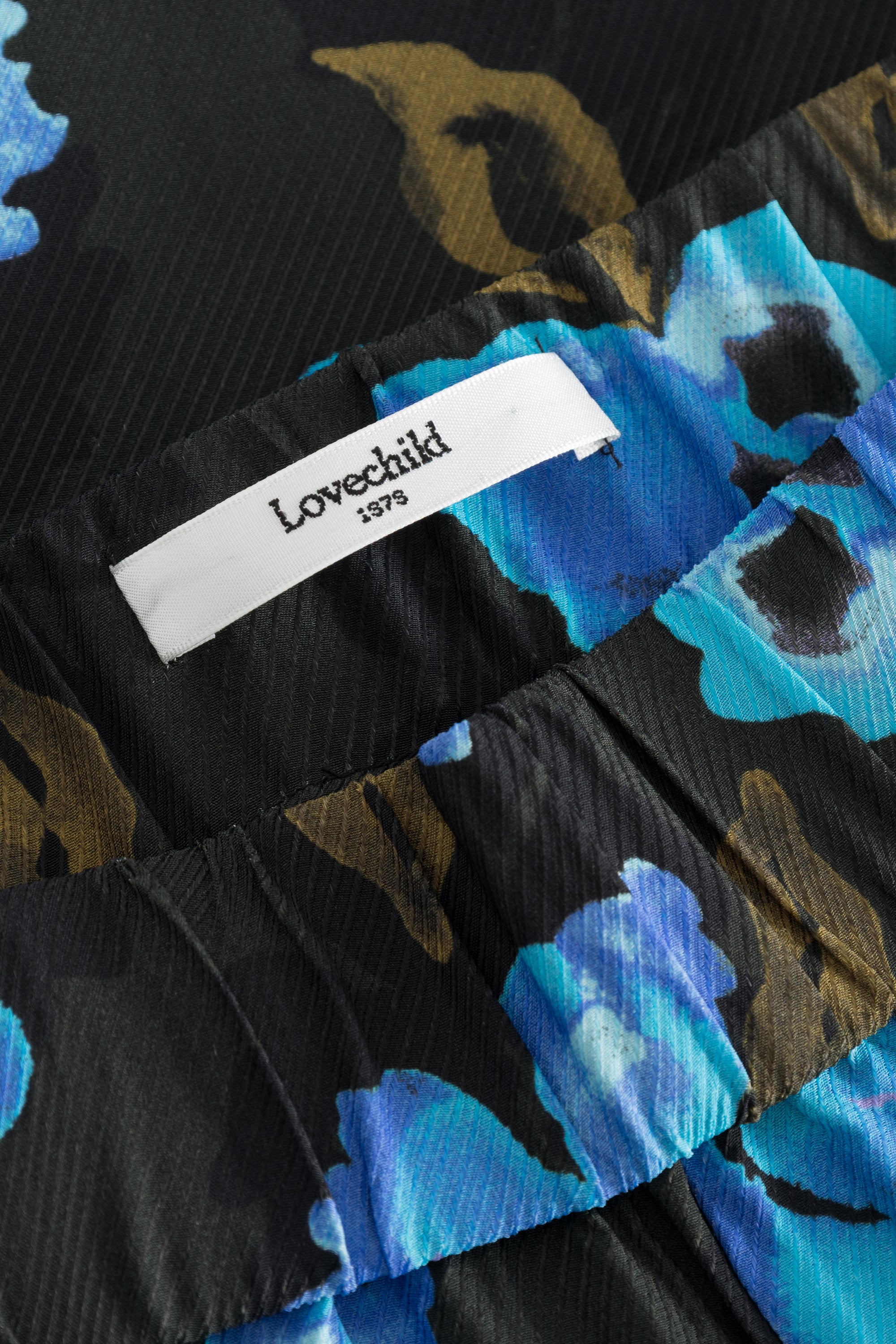 Nicoline trousers are in a delicious printed stretch viscose with blue flowers on a black base. The trousers have elastic at the waist, patch pockets, wide legs and 6cm wide hems.