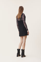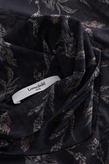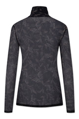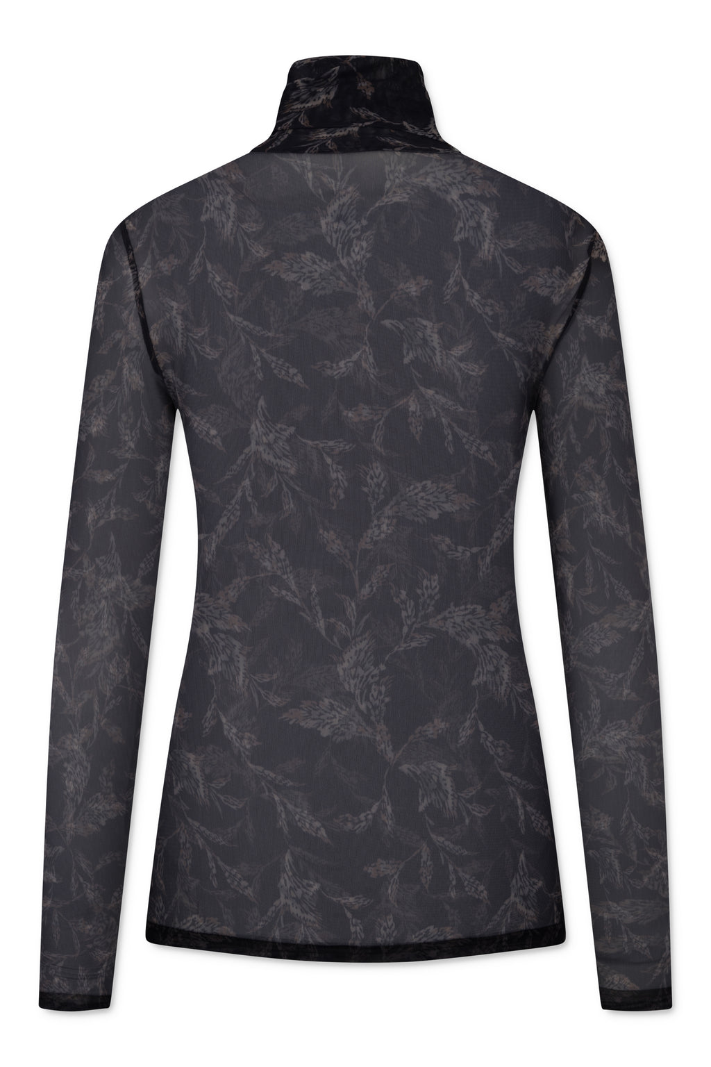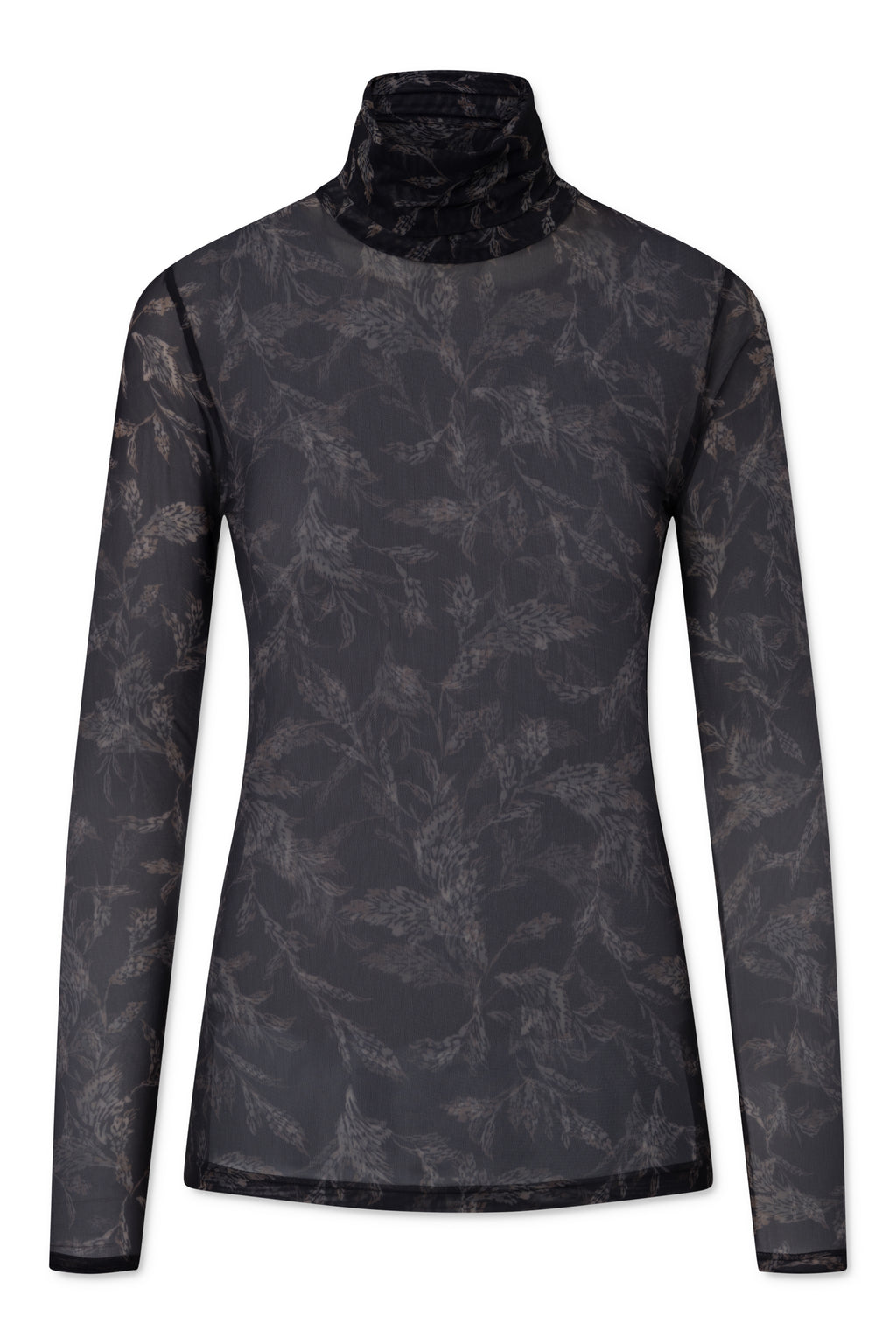 Classic turtleneck with long slim sleeves. Tulip turtleneck is in a delicious thin printed mesh. The print is a mix of flowers in off white and beige shades on a black background. The turtleneck is double and gathered.