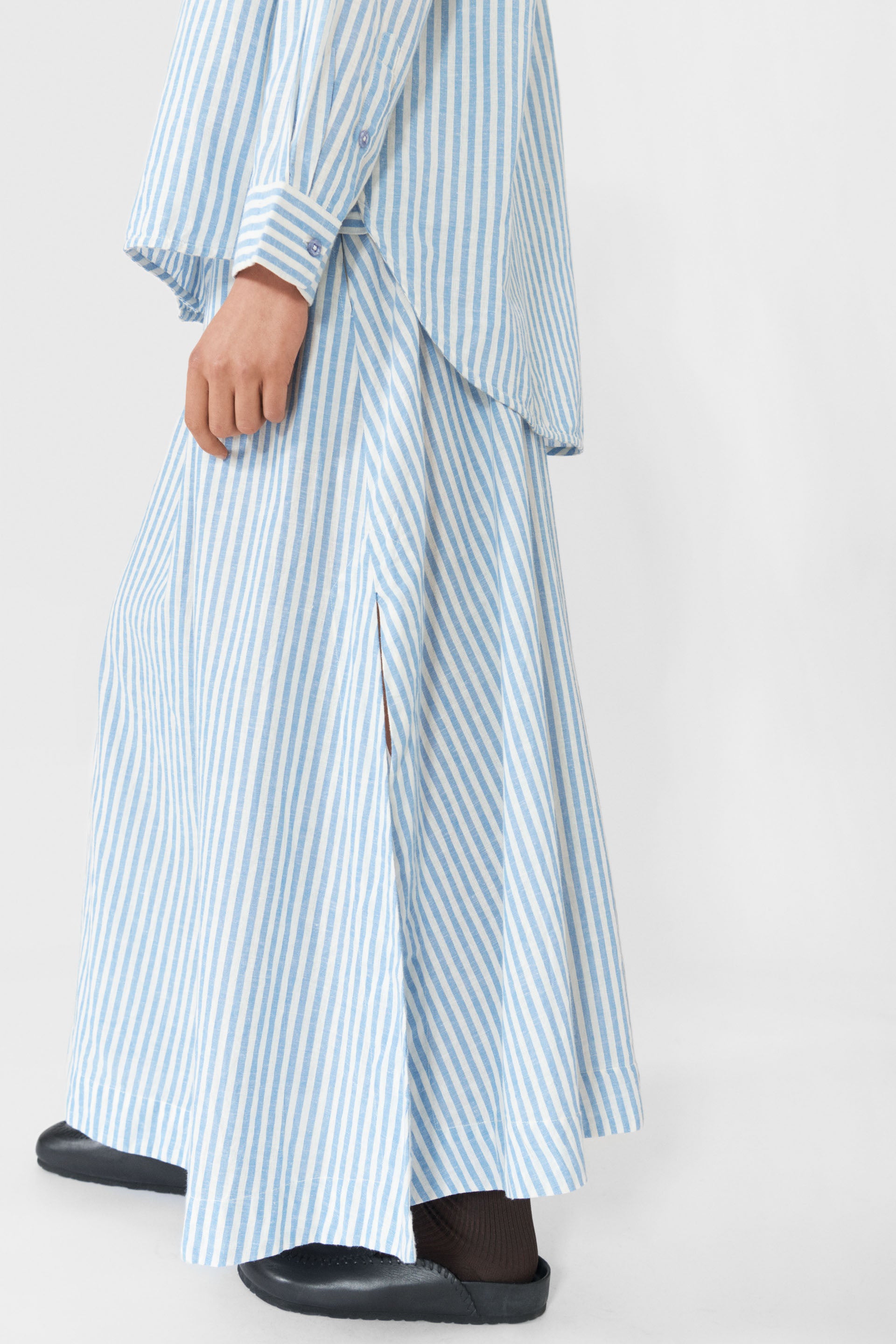Beautiful airy skirt in a delicious stribed cotton with high slits at the side, elastic waist and pockets in the side seam. The look is elegant and feminine.