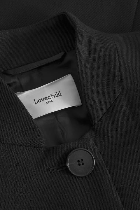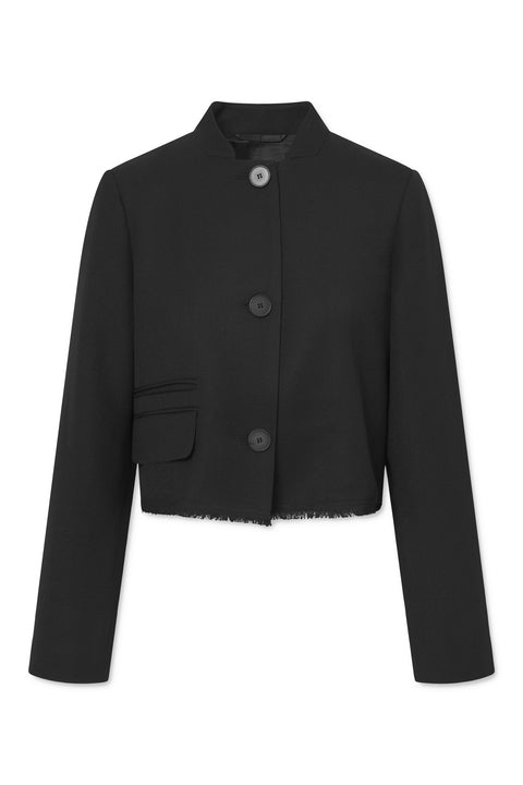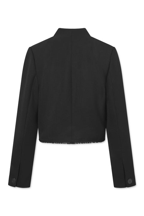 Cropped og boxy blazer med en opretstående krave. Lomme med kant og lommeklap på den ene side. Rå kant forneden og knap lukning foran.