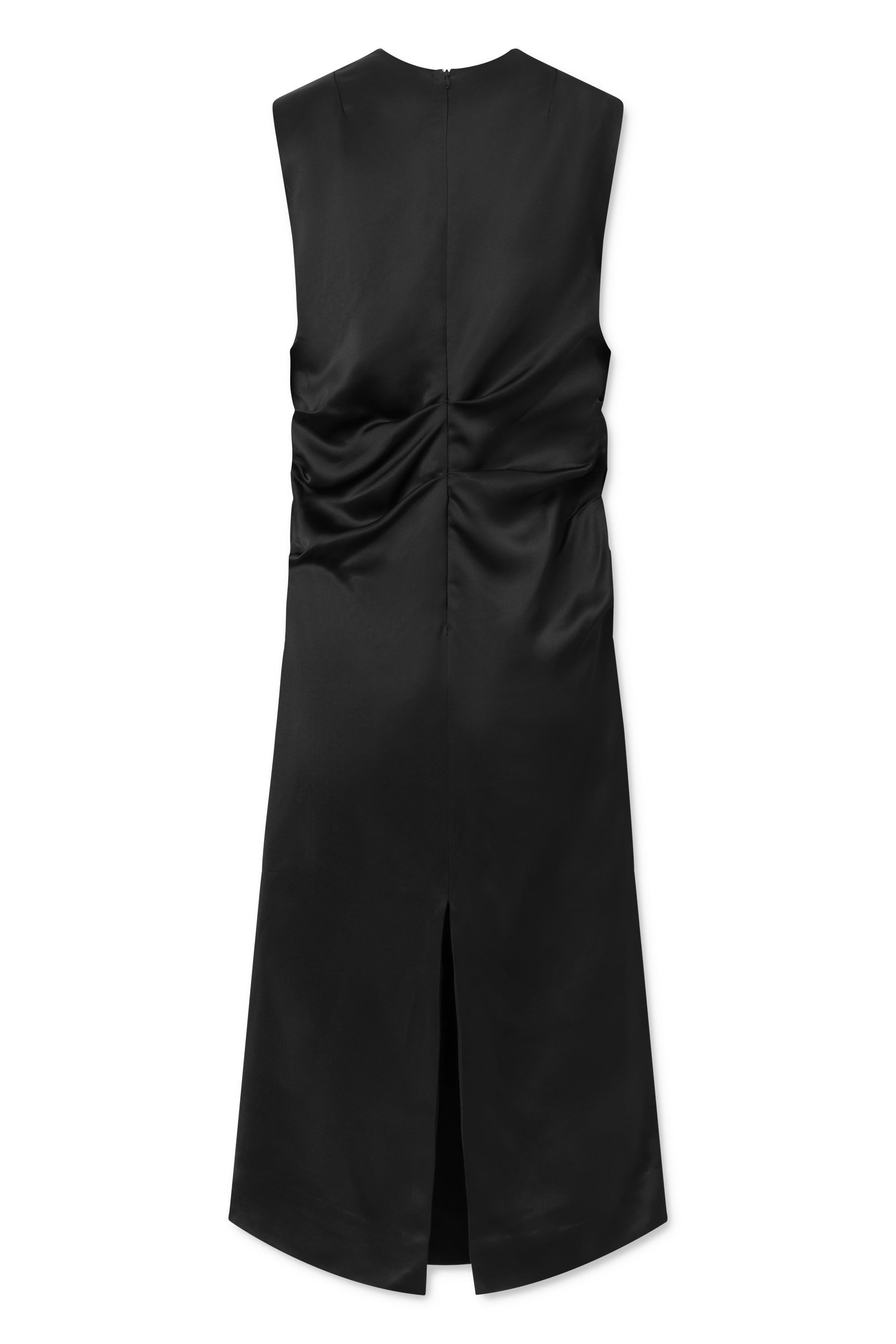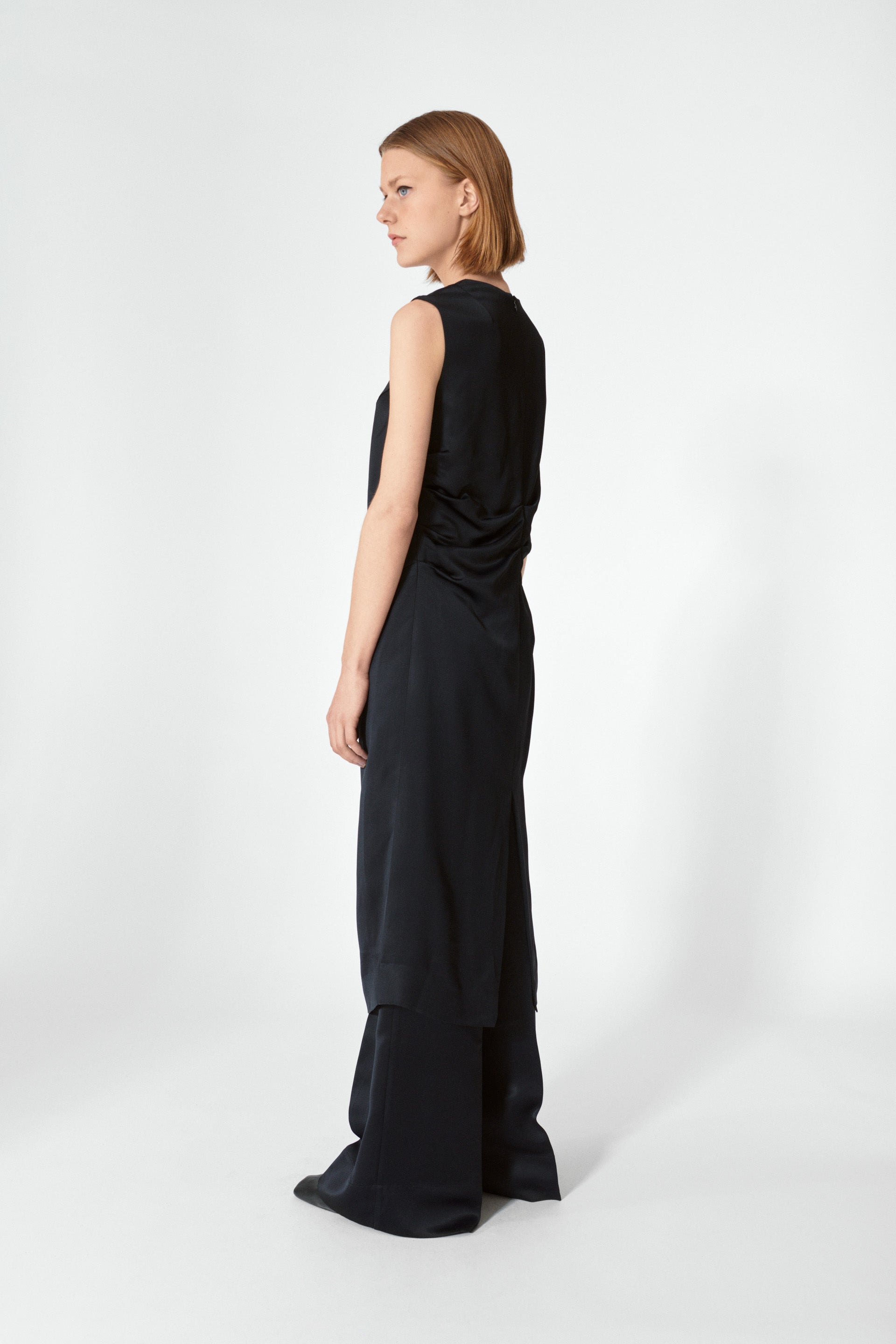 Ærmeløs kjole i en tung viskosekvalitet med to læg i taljen i sidesømmen på fronten. Kjolen knappes bag i halsen og har ligeledes slids bag. Looket er kropsnær og elegant.