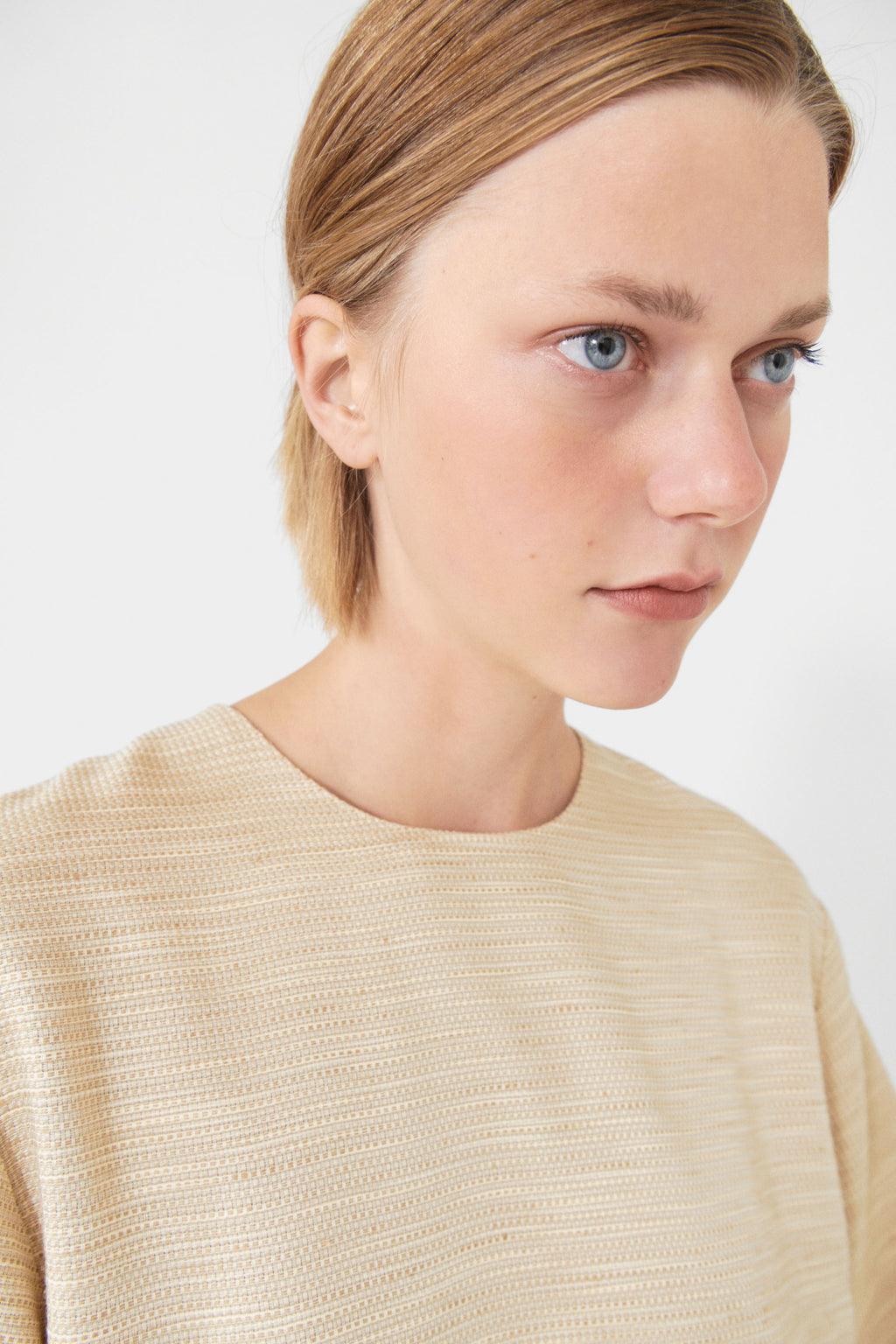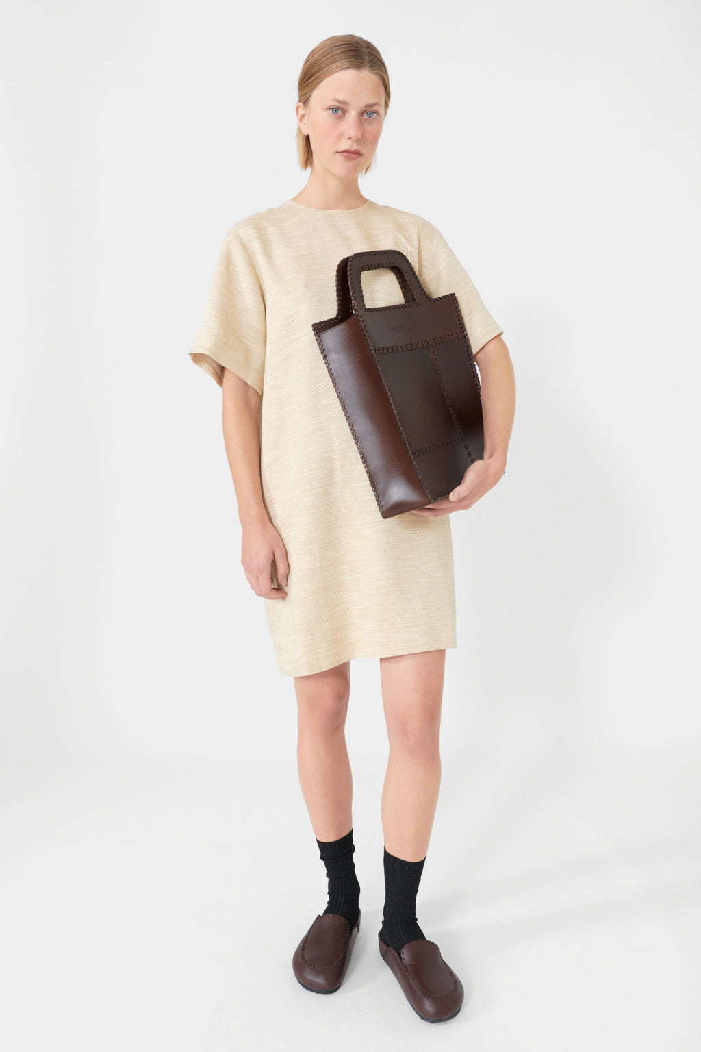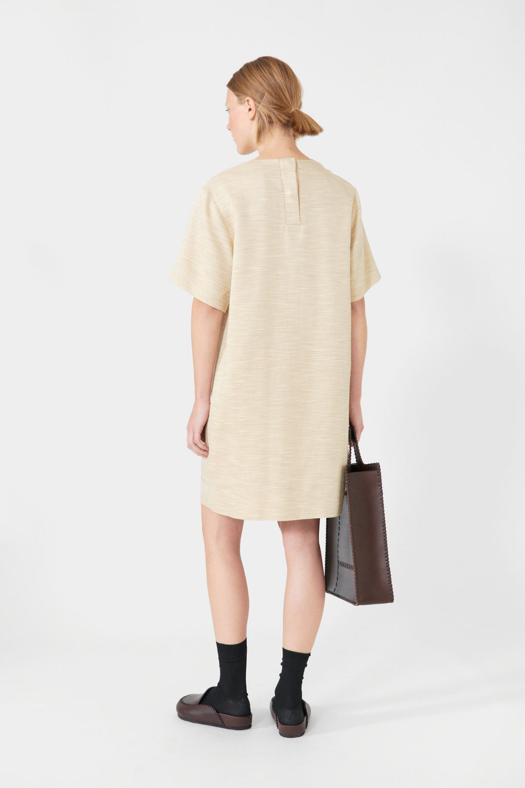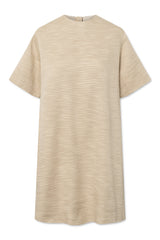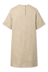 T-Shirt kjole i en længde til lidt over knæet - her i en lækker hør/bomuldskvalitet. Kjolen lukkes bag i en bred stolpelukning der knappes med betrukne knapper. Ydermere er kjolen gennemforet. Looket er afslappet med en normal pasform.