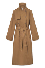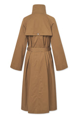 Løstsiddende trenchcoat, raglanærmer med yoke-detalje og aftageligt bælte.