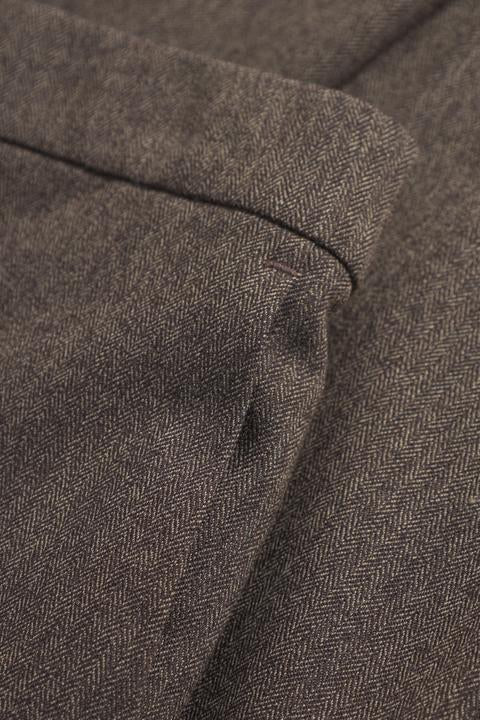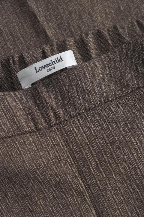 Lige bukser med fast lining, elastik i taljen i bagsiden, pressefolder og stiklommer foran i en herringbone kvalitet. Bukserne har foer indvendigt, som går under knæen og er lavet af viscose.