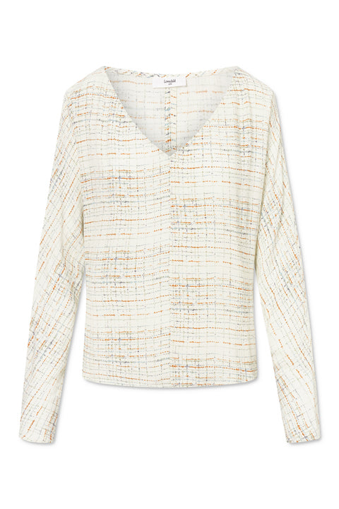 Flagermus ærmet bluse med en bredde v-halsudskæring i en viscose crepe kvalitet. Blusen er tætsiddende under taljen med søm i midten foran og bagpå.