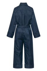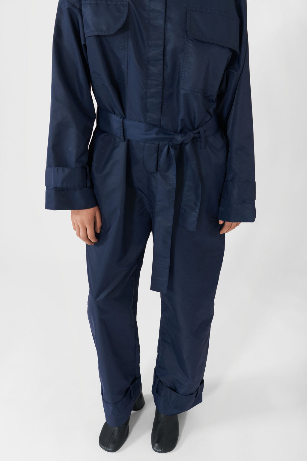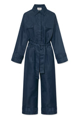 Oversized bukserdragt med en krave, skjulte knaplukning foran. Påsyede lommer med lommeklapper og lommer i sidesømmene. Stropper ved ærmerne og ved bunden af benene. Bælte i taljen.