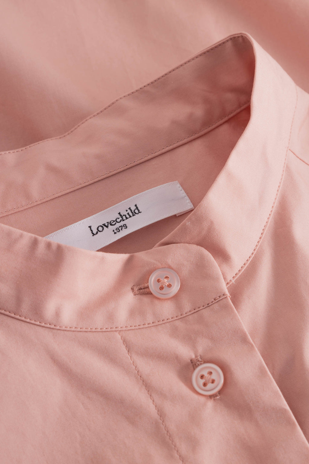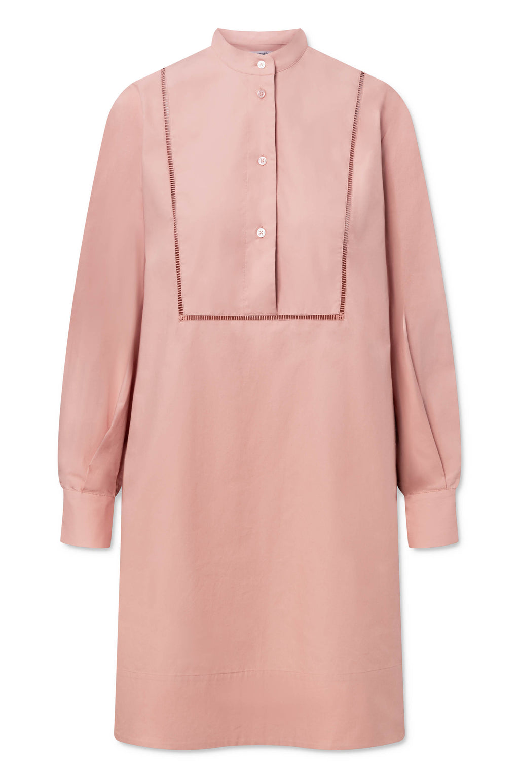 Smuk skjortekjole med fint broderikant, kinakrave og stolpelukning. Lommer i sidesømmen. Looket er oversized og afslappet.