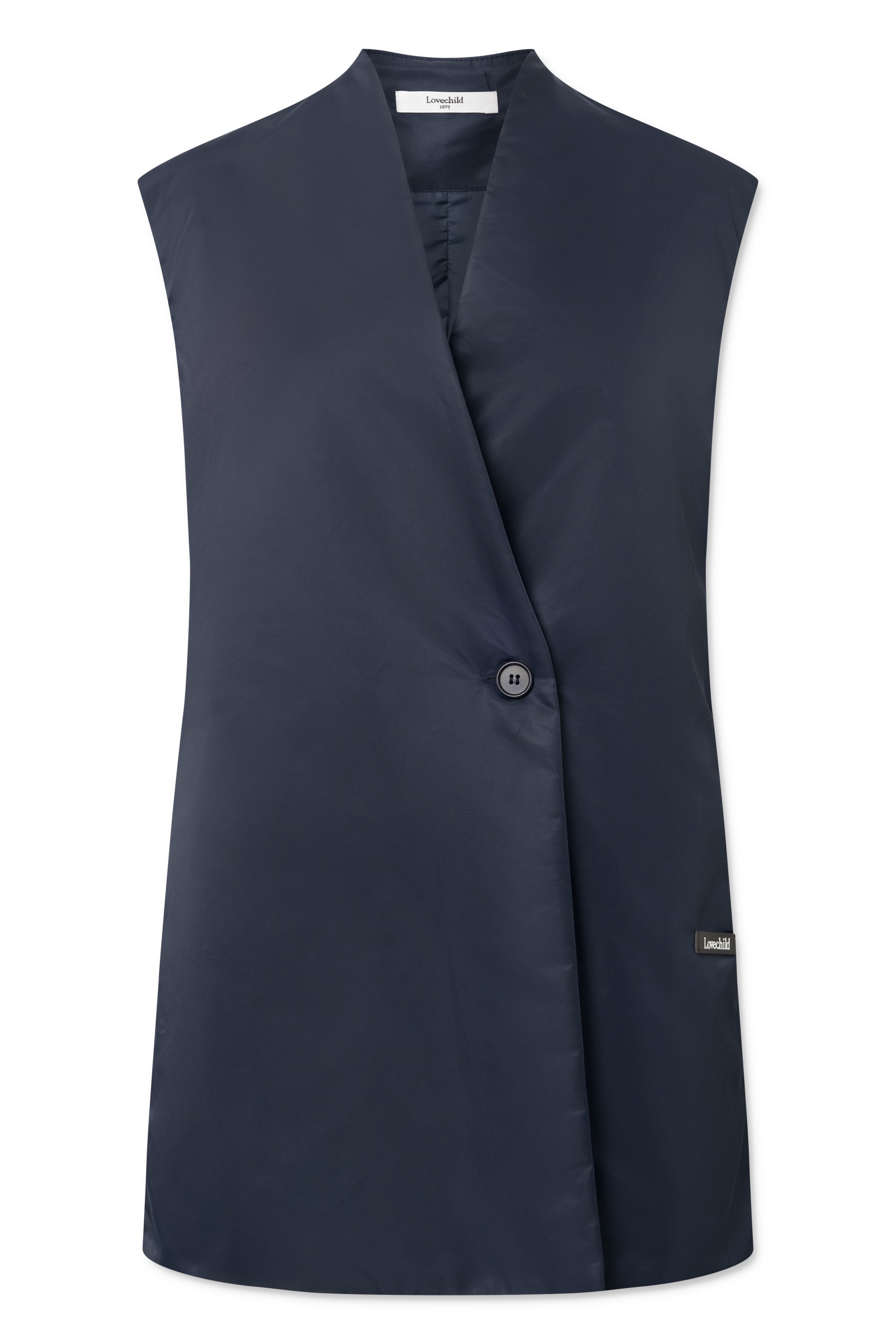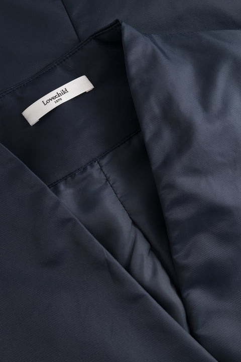 Vest i en padded nylon med Lovechild1979 logo i gummi. Knappes med én enkelt knap, har lommer i sidesømmen og slidser i begge sider. Looket er elegant og afslappet.