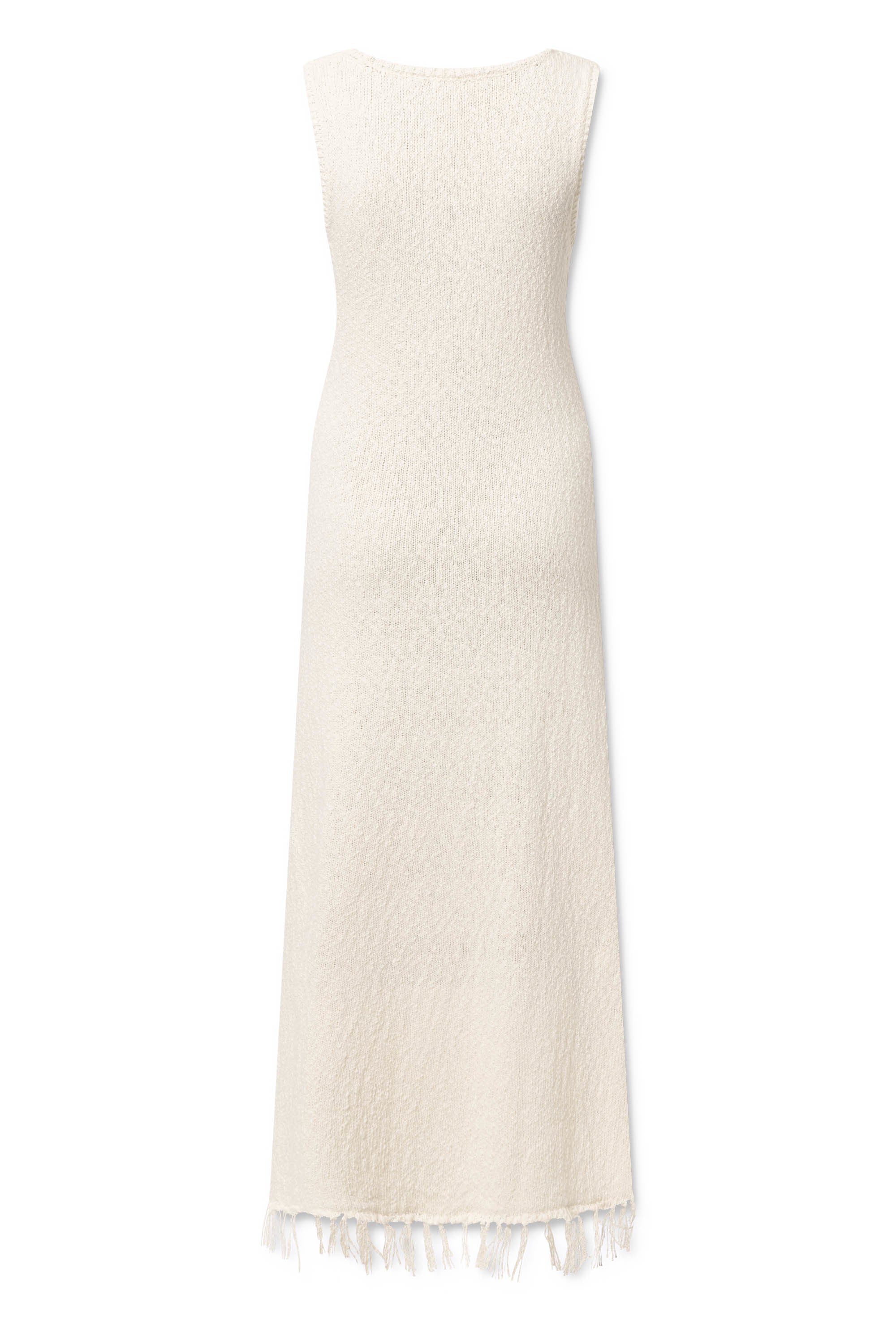 Skøn lang T-shirt strikkjole i en lækker bomuld/hørkvalitet med frynser forneden. Looket er afslappet og kropsnært.