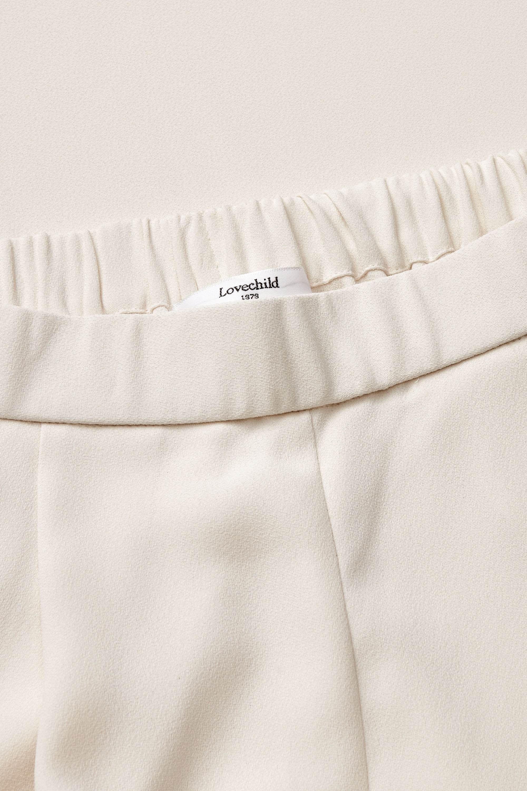 Bukser med mellemhøj til høj talje, med læg og paspolerede lommer. Elastik i taljen. Brede bukser i fuld længde.