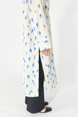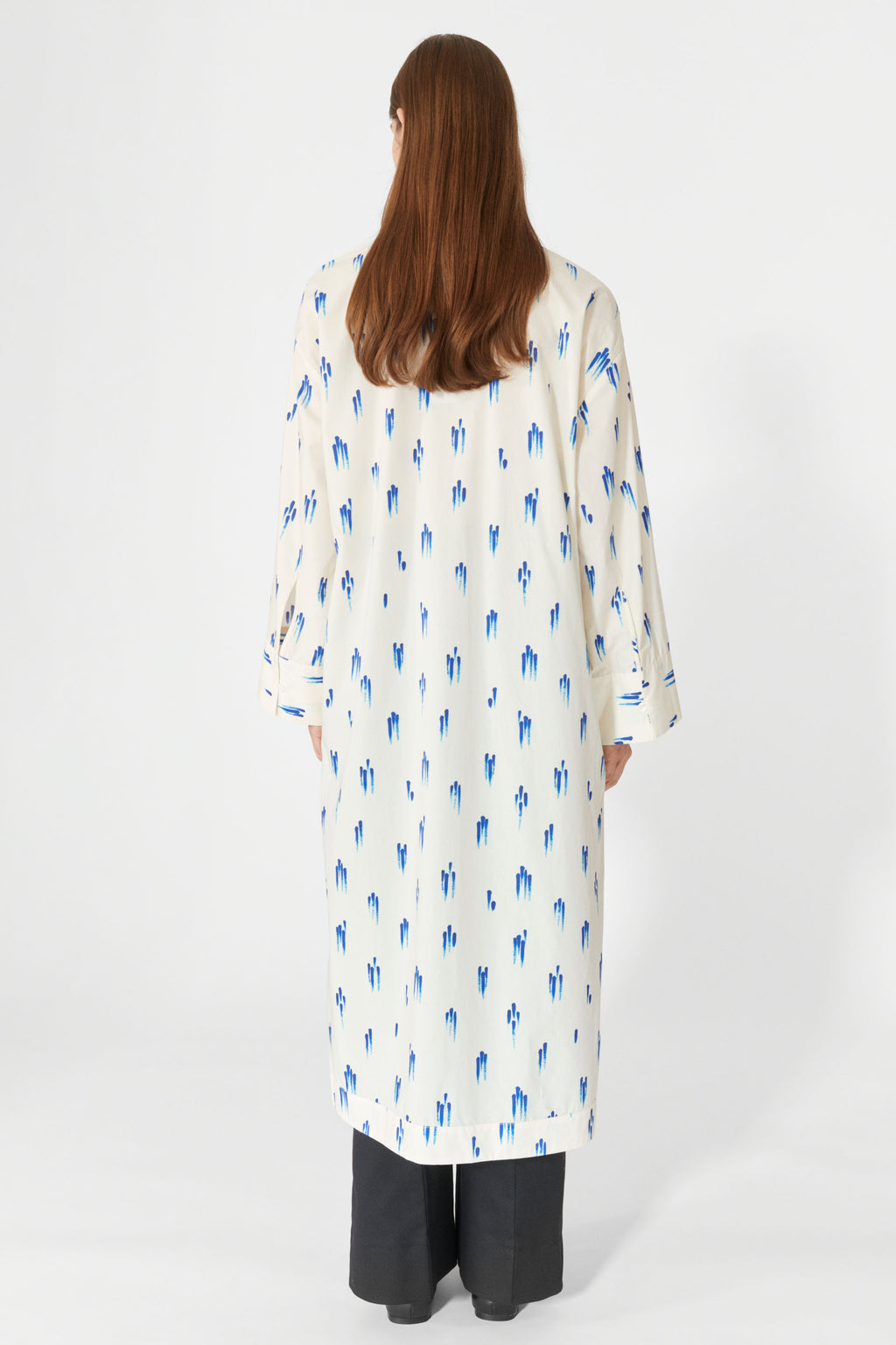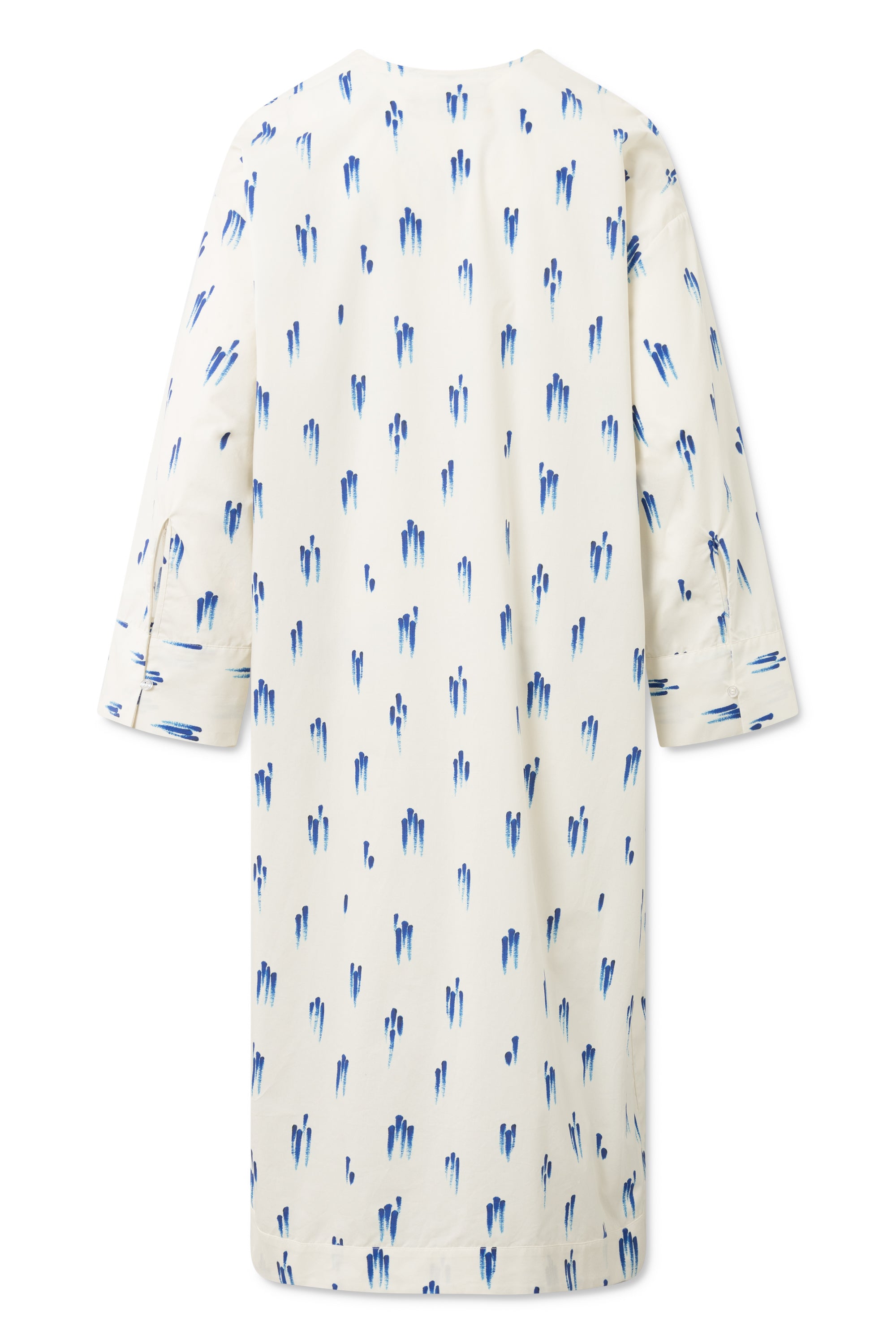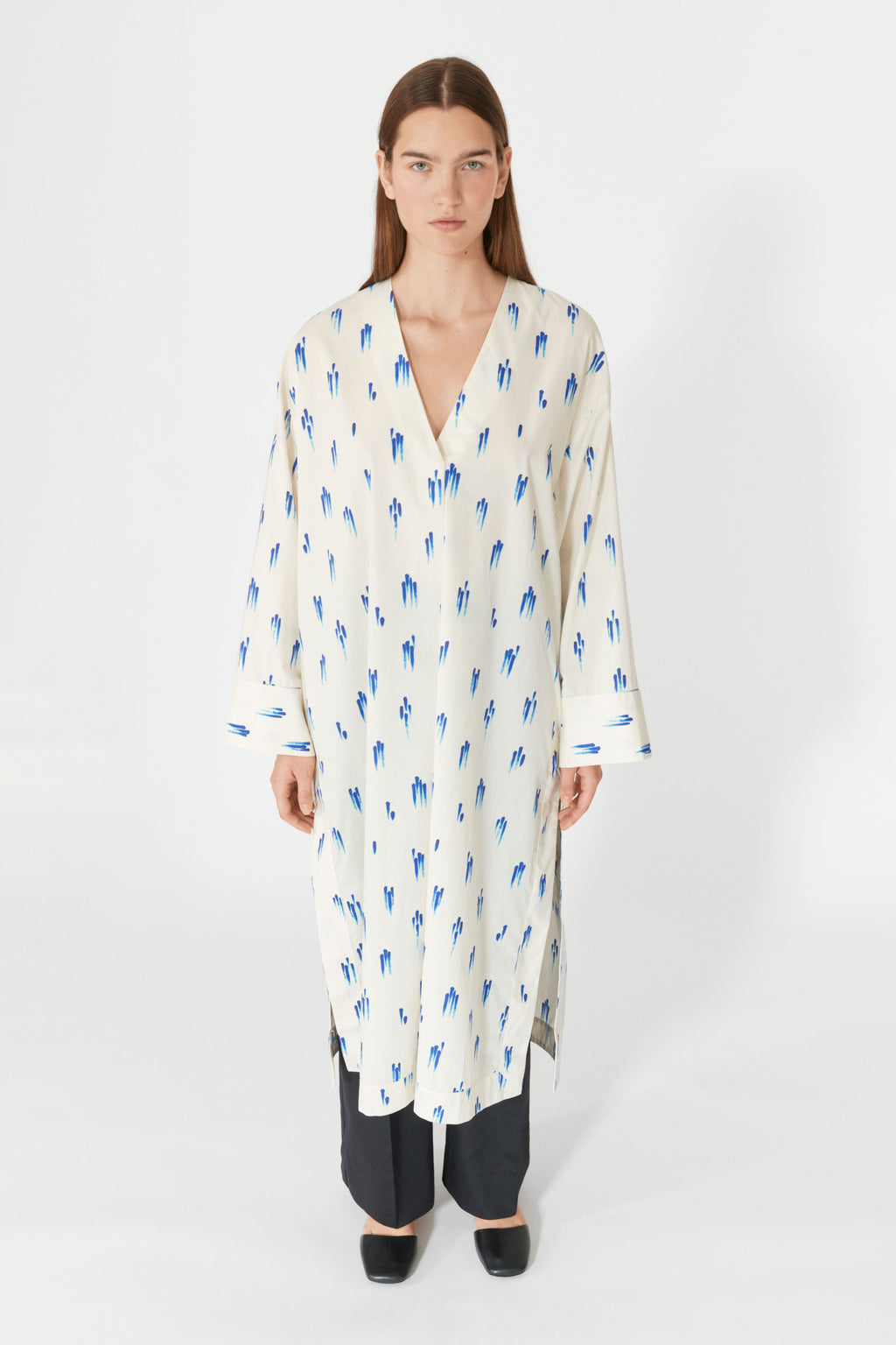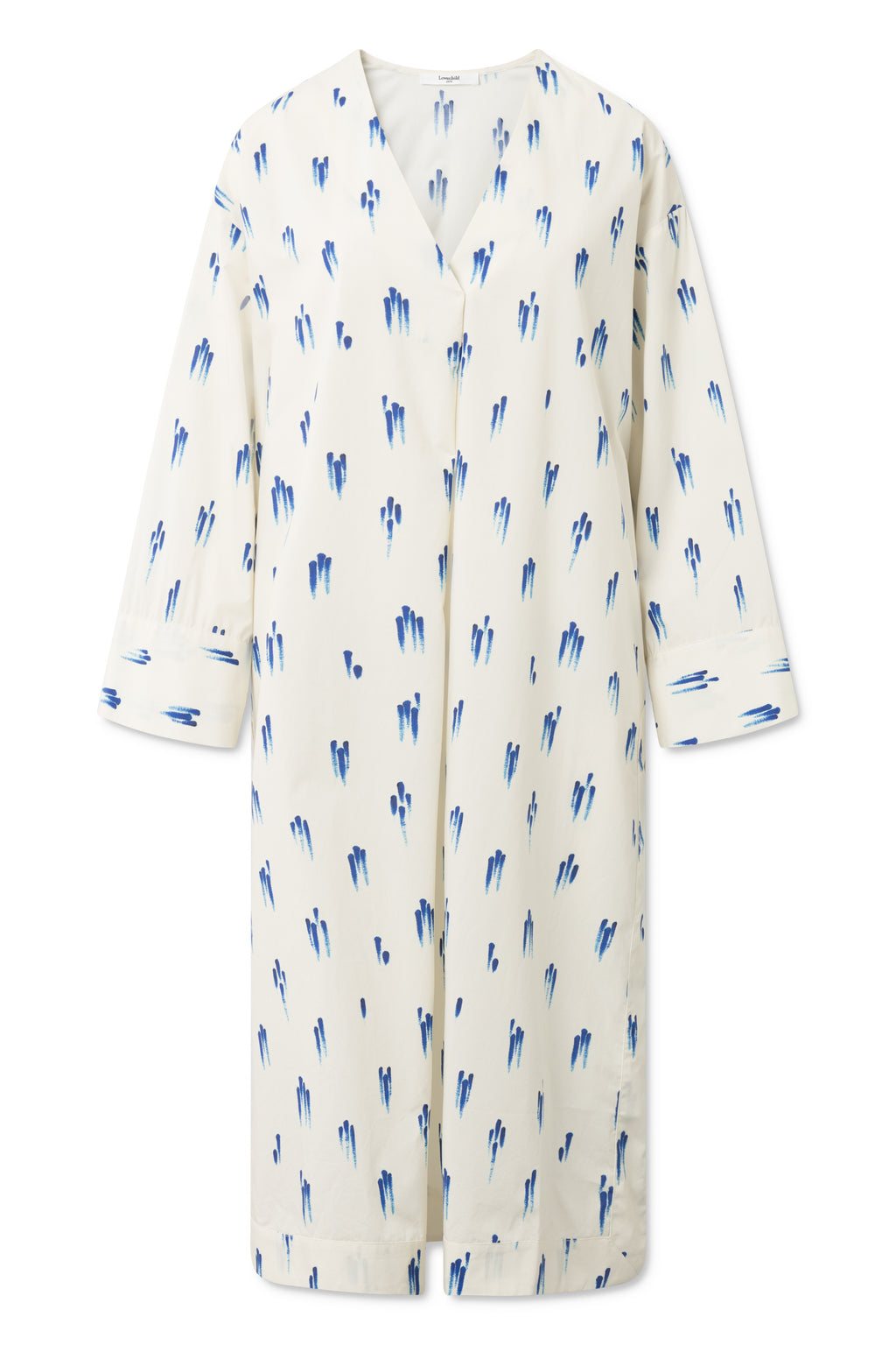 Skøn kjole med V-udskæring og læg foran. Langærmet med manchetter og høje slidser i sidesømmene. Looket er løst, afslappet og oversized.