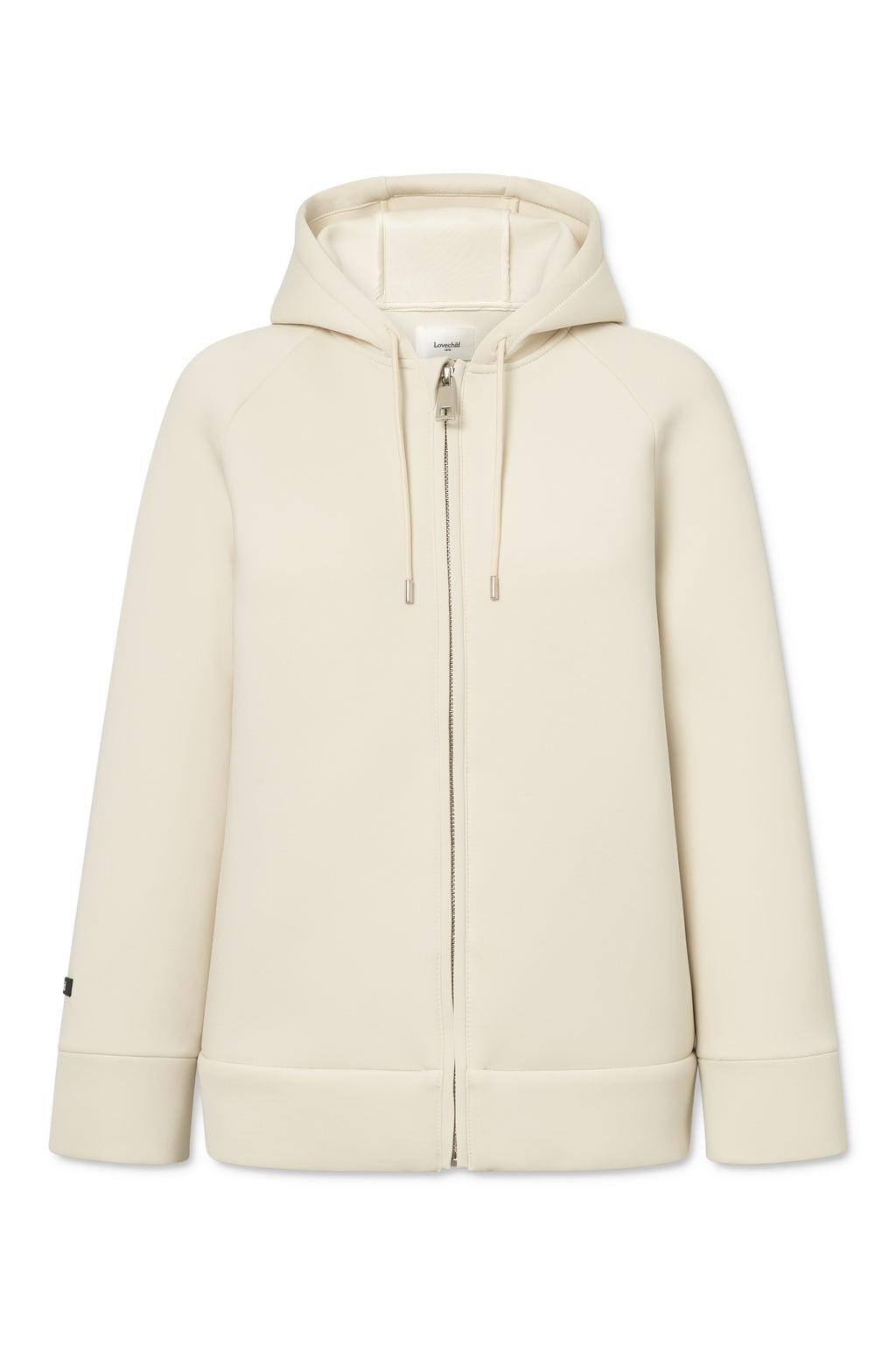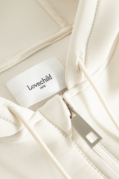 Cool hoodie i neopren med raglanærmer, hætte med snøre og lommer i sidesømmen. Lynes foran med kraftig sølv lynlås. Looket er afslappet og boxy pasform.