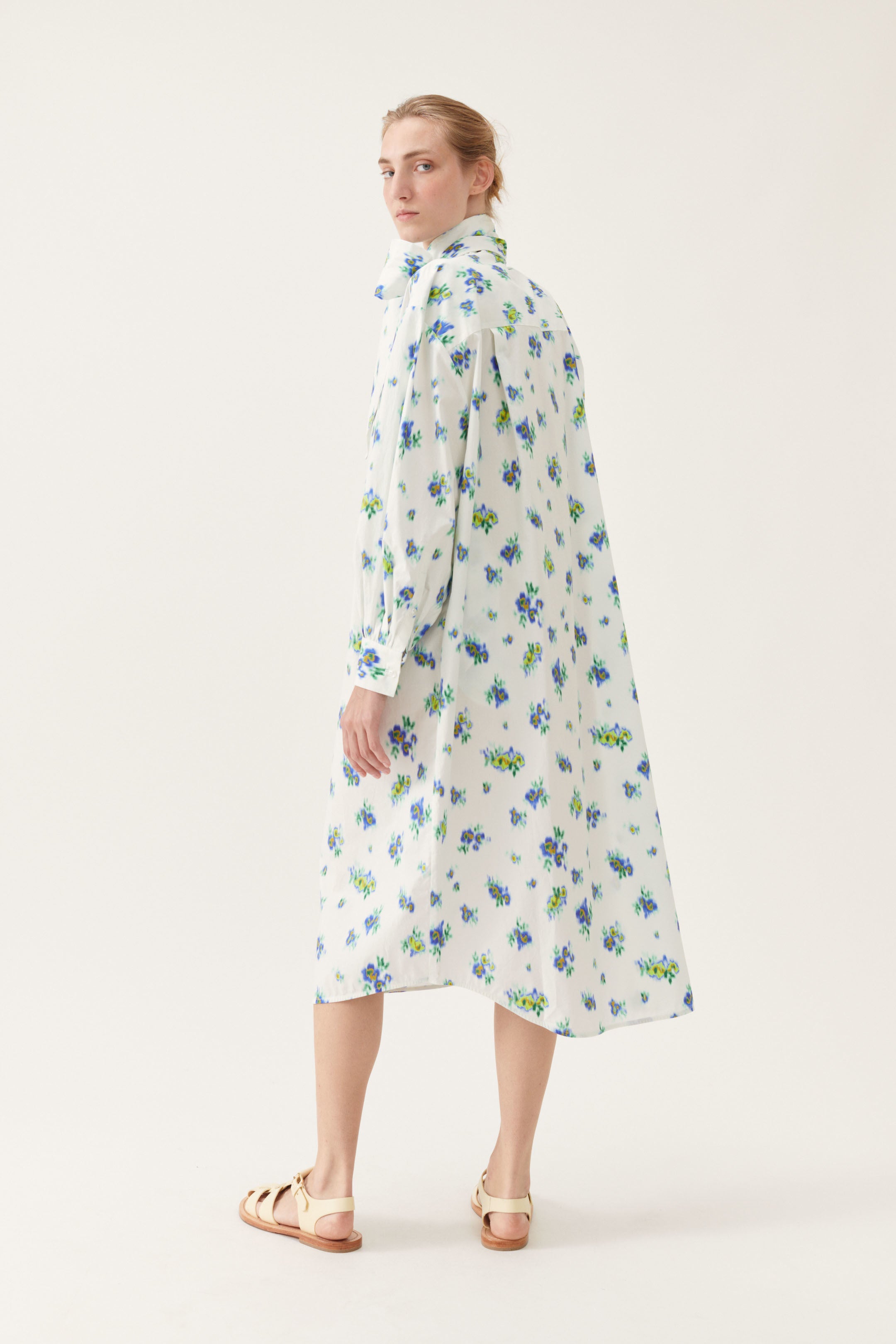Skøn hvid sommerkjole i lækker bomuldspoplin med det fineste blomsterprint. Scarletta kjole har en lille krave, skjult stolpelukning og lommer i sidesømmen. Bag har kjolen et bærestykke med små skulderlæg.