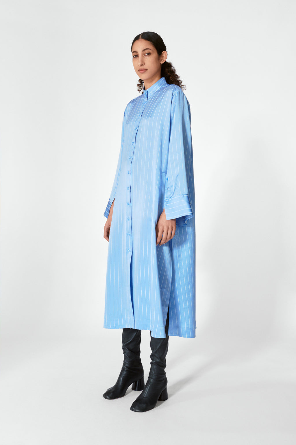Skøn skjortekjole i en lækker viskosekvalitet med høj kinakrave. Ærmerne er lange med bred manchet og lang slids. Bæltet er aftageligt. Looket er afslappet og oversized.