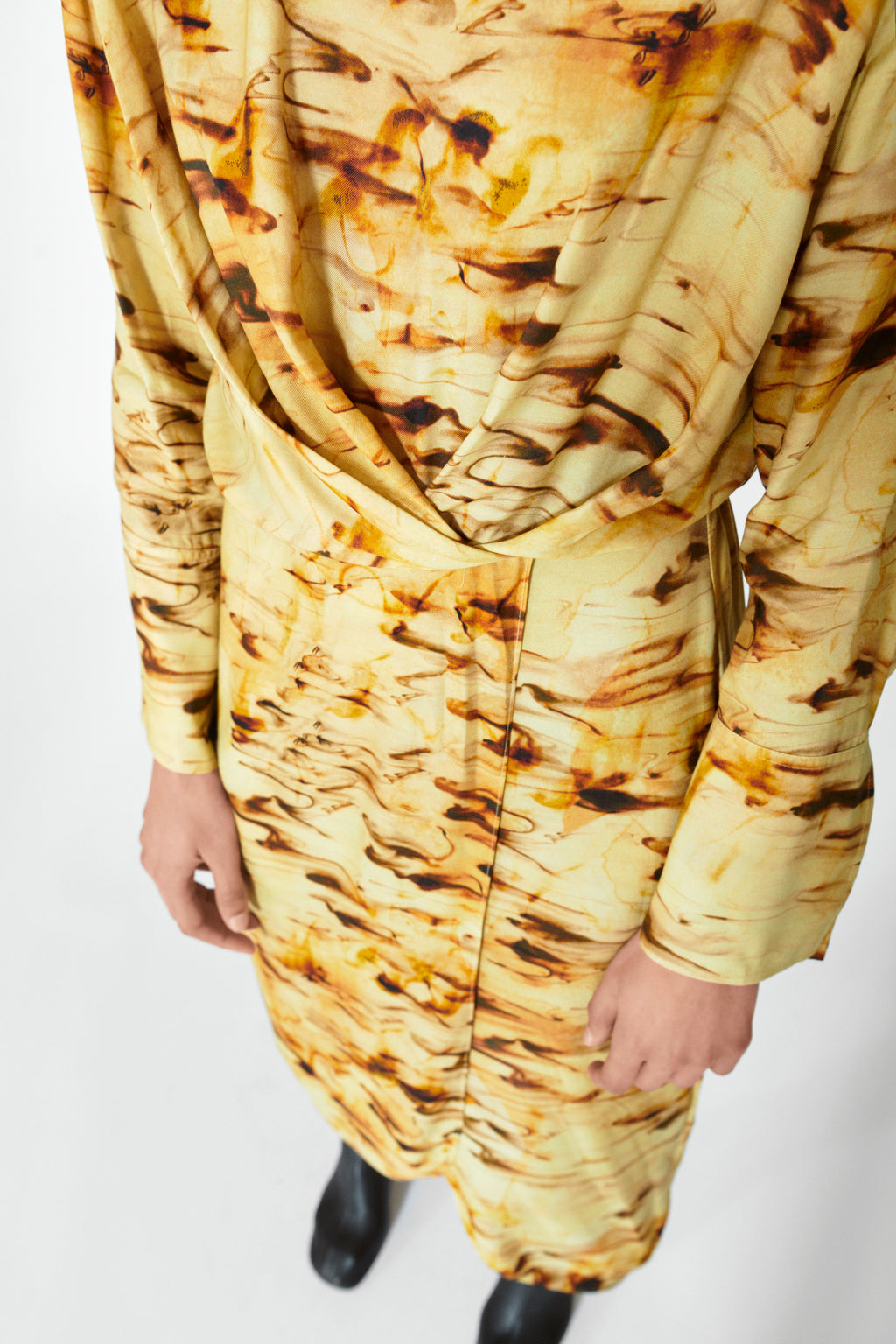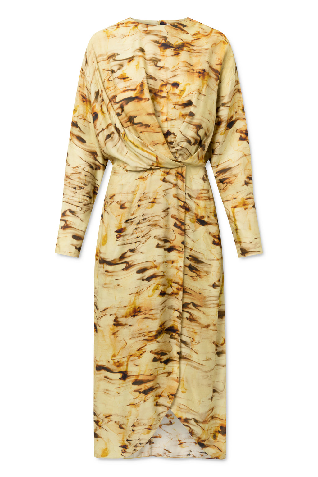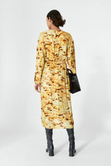 Printet kjole i en lækker silke/viskose kvalitet med rundhals, langeærmer, draperet detalje i taljen og buede slids foran. Looket er elegant med normal pasform.