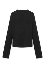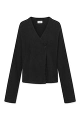 Asymmetrisk cardigan med v-halsudskæring og en knap. Høj rib kant på ærmerne.